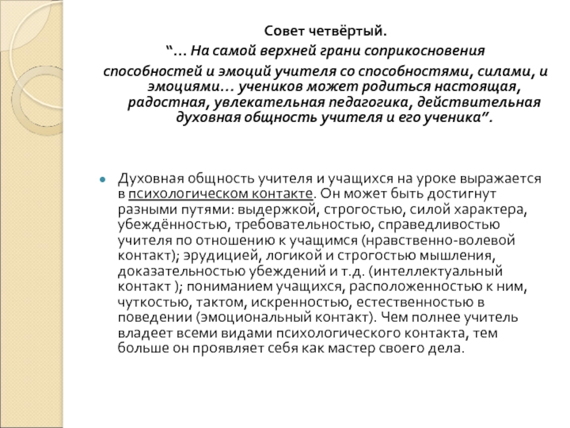Духовная общность учителя и учащихся на уроке выражается в психологическом контакте. Он может быть достигнут разными путями: выдержкой, строгостью, силой характера, убеждённостью, требовательностью, справедливостью учителя по отношению к учащимся (нравственно-волевой контакт); эрудицией, логикой и строгостью мышления, доказательностью убеждений и т.д. (интеллектуальный контакт ); пониманием учащихся, расположенностью к ним, чуткостью, тактом, искренностью, естественностью в поведении (эмоциональный контакт). Чем полнее учитель владеет всеми видами психологического контакта, тем больше он проявляет себя как мастер своего дела.