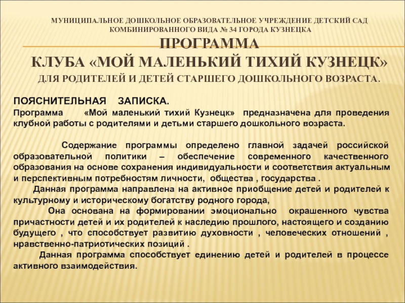 Программа «Мой маленький тихий Кузнецк» предназначена для проведения клубной работы с родителями и детьми старшего дошкольного возраста.