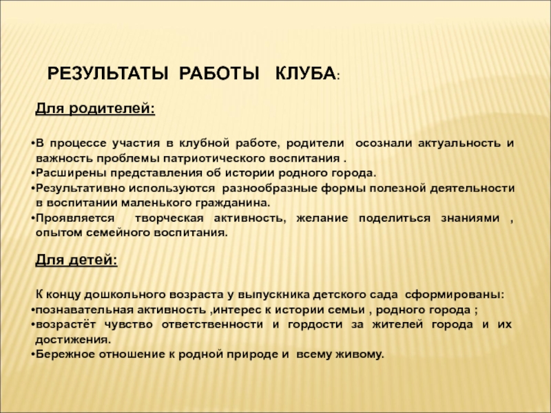 Она основана на формировании эмоционально окрашенного чувства причастности детей и их родителей к наследию прошлого, настоящего и созданию будущего , что способствует развитию духовности , человеческих отношений , нравственно-патриотических позиций .
