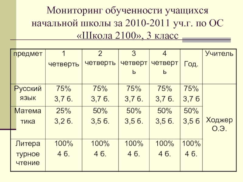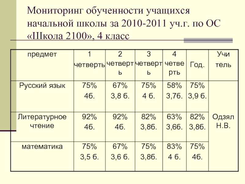 Слайд 9Мониторинг обученности учащихся начальной школы за 2010-2011 уч.г. по ОС «Школа