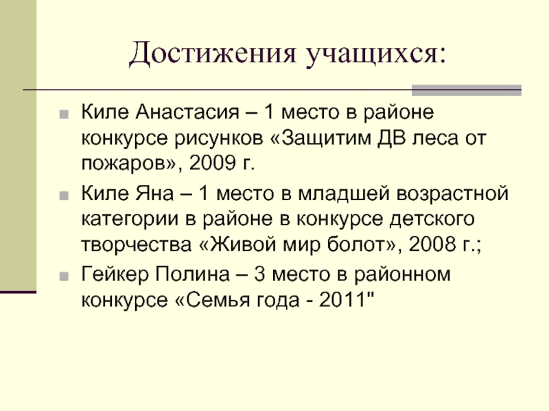 Киле Яна – 1 место в младшей возрастной категории в районе в конкурсе детского творчества «Живой мир болот», 2008 г.;