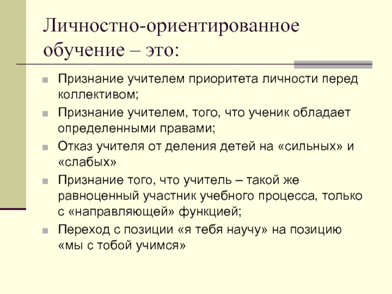 Признание того, что учитель – такой же равноценный участник учебного процесса, только с «направляющей» функцией;