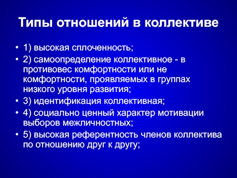 5) высокая референтность членов коллектива по отношению друг к другу;