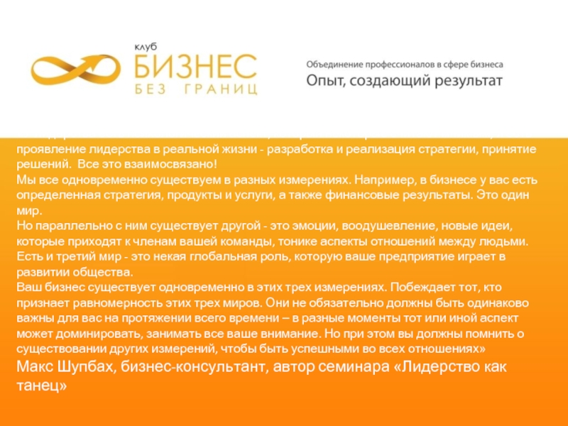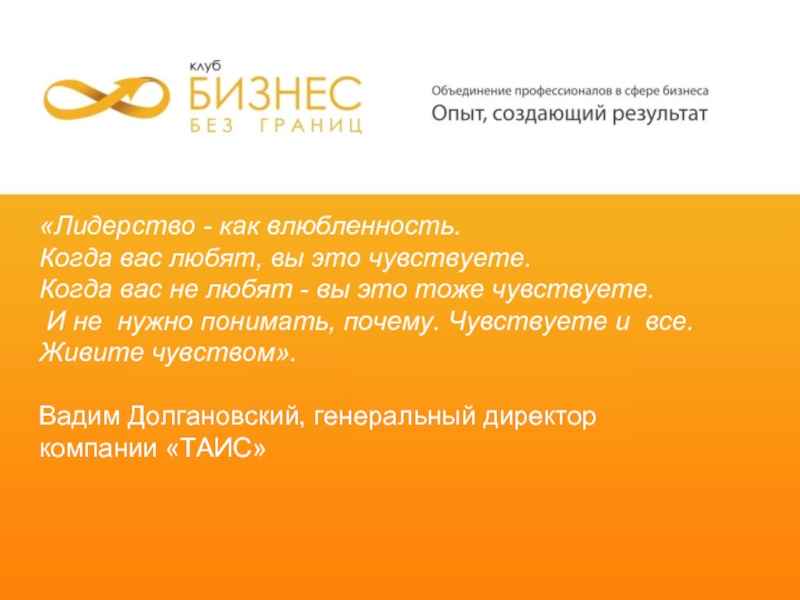 «Лидерство - как влюбленность. Когда вас любят, вы это чувствуете. Когда вас не любят - вы это тоже чувствуете. И не нужно понимать, почему. Чувствуете и все. Живите чувством».