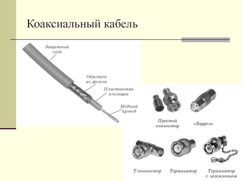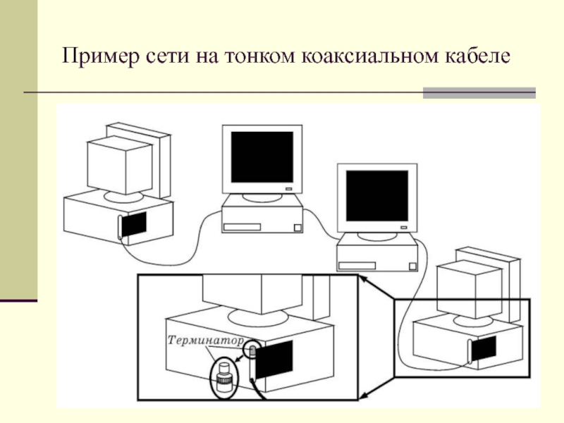 Слайд 4Пример сети на тонком коаксиальном кабеле