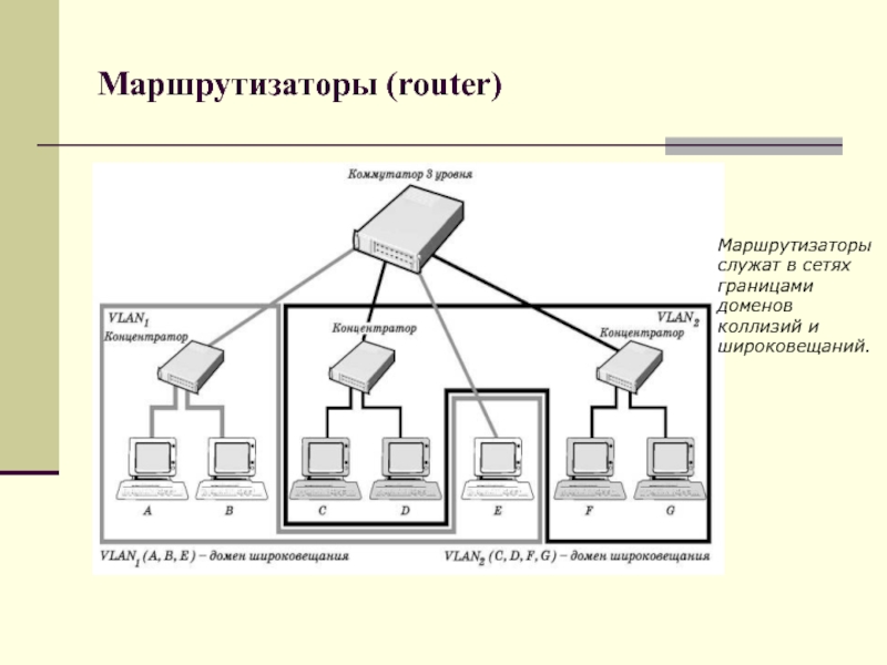 Маршрутизаторы служат в сетях границами доменов коллизий и широковещаний.