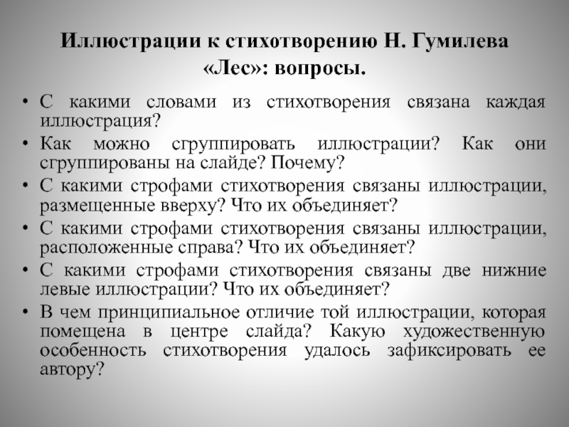 Слайд 19Иллюстрации к стихотворению Н. Гумилева «Лес»: вопросы.