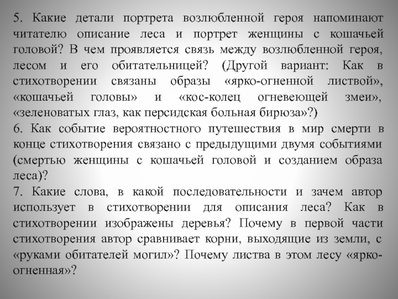 7. Какие слова, в какой последовательности и зачем автор использует в стихотворении для описания леса? Как в стихотворении изображены деревья? Почему в первой части стихотворения автор сравнивает корни, выходящие из земли, с «руками обитателей могил»? Почему листва в этом лесу «ярко-огненная»?