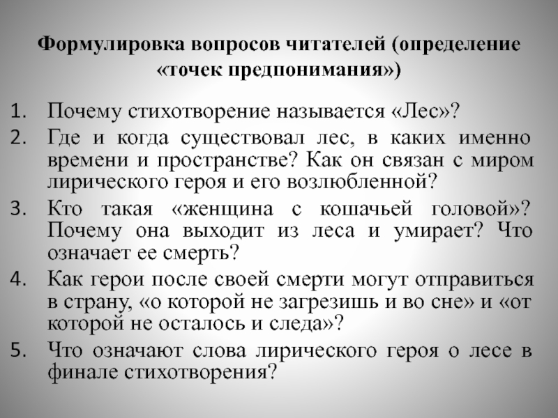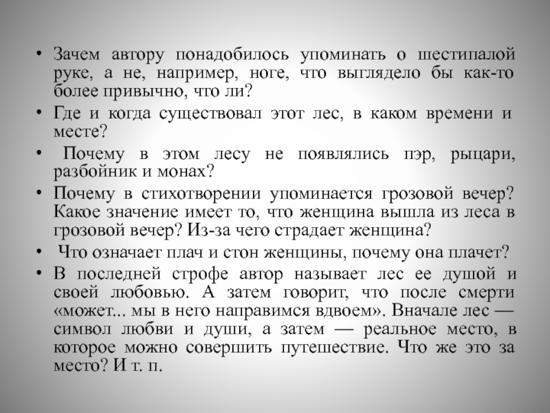 В последней строфе автор называет лес ее душой и своей любовью. А затем говорит, что после смерти «может... мы в него направимся вдвоем». Вначале лес — символ любви и души, а затем — реальное место, в которое можно совершить путешествие. Что же это за место? И т. п.