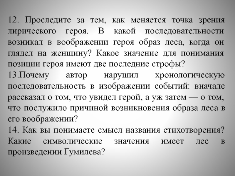 14. Как вы понимаете смысл названия стихотворения? Какие символические значения имеет лес в произведении Гумилева?