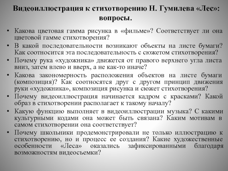Слайд 21 Видеоиллюстрация к стихотворению Н. Гумилева «Лес»: вопросы.