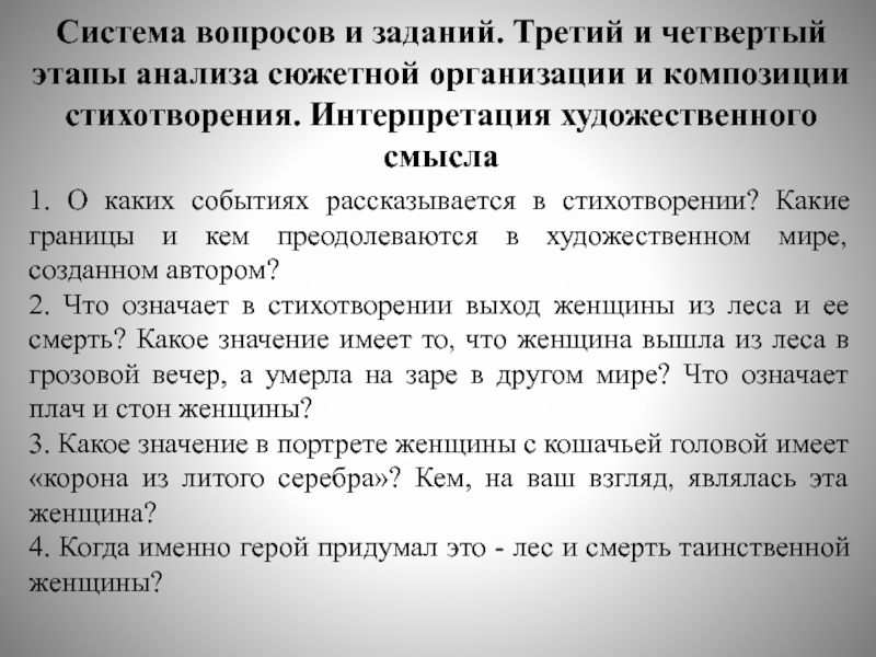 Слайд 7Система вопросов и заданий. Третий и четвертый этапы анализа сюжетной организации