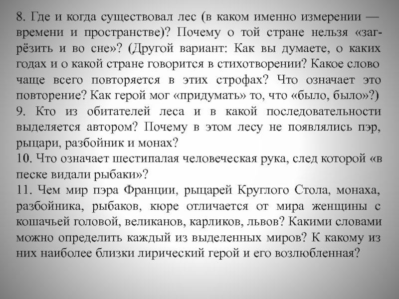 11. Чем мир пэра Франции, рыцарей Круглого Стола, монаха, разбойника, рыбаков, кюре отличается от мира женщины с кошачьей головой, великанов, карликов, львов? Какими словами можно определить каждый из выделенных миров? К какому из них наиболее близки лирический герой и его возлюбленная?