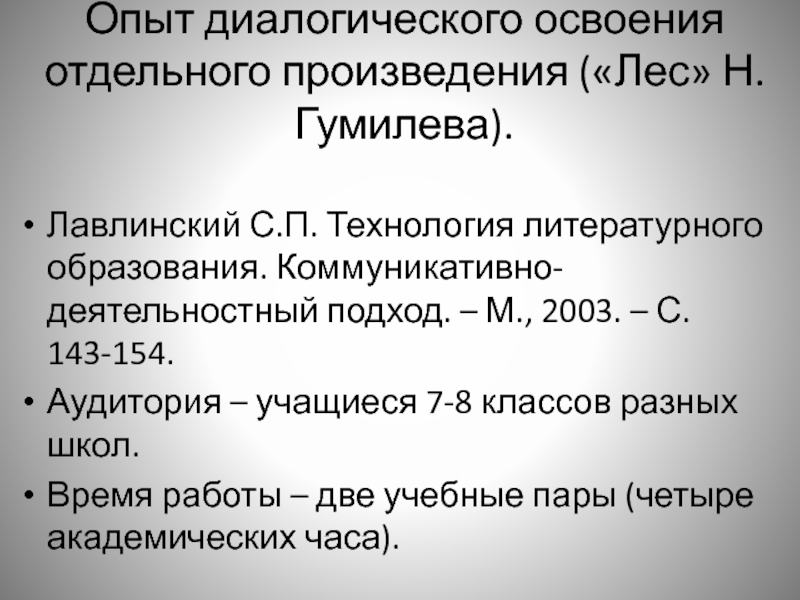Слайд 3Опыт диалогического освоения отдельного произведения («Лес» Н. Гумилева).