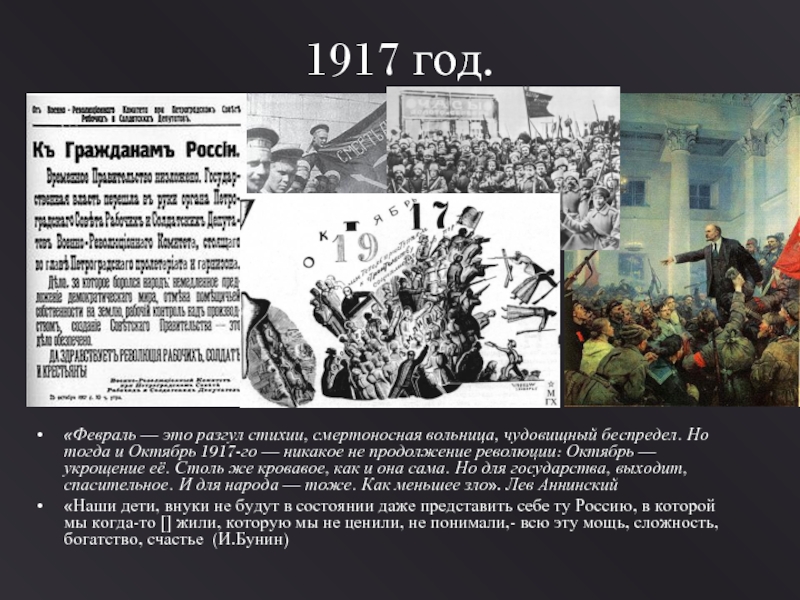 и Октябрь 1917-го — никакое не продолжение революции: Октябрь — укрощение её. Столь же кровавое, как и она сама. Но для государства, выходит, спасительное. И для народа — тоже. Как меньшее зло». Лев Аннинский