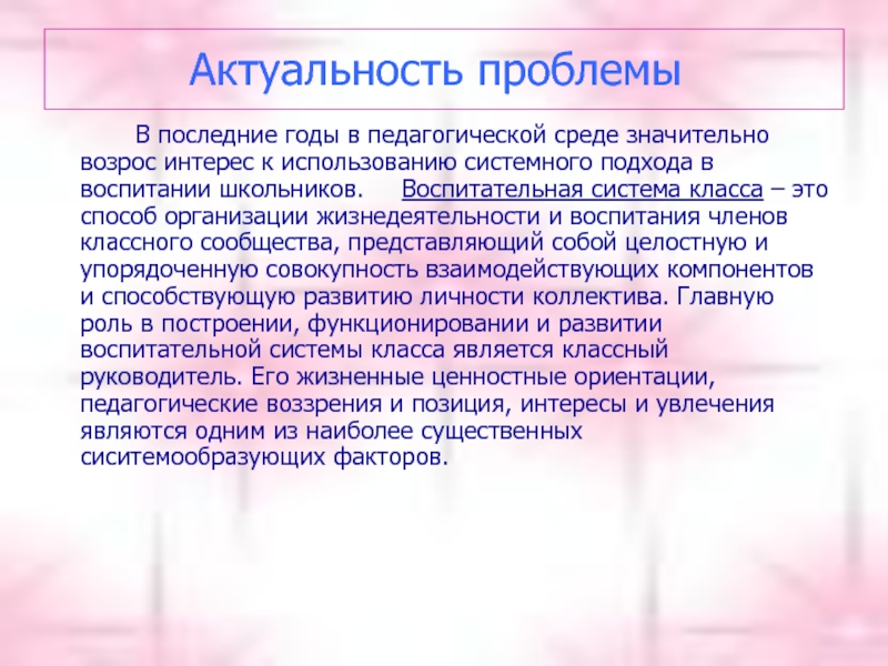 использованию системного подхода в воспитании школьников. Воспитательная система класса – это способ организации жизнедеятельности и воспитания членов классного сообщества, представляющий собой целостную и упорядоченную совокупность взаимодействующих компонентов и способствующую развитию личности коллектива. Главную роль в построении, функционировании и развитии воспитательной системы класса является классный руководитель. Его жизненные ценностные ориентации, педагогические воззрения и позиция, интересы и увлечения являются одним из наиболее существенных сиситемообразующих факторов.