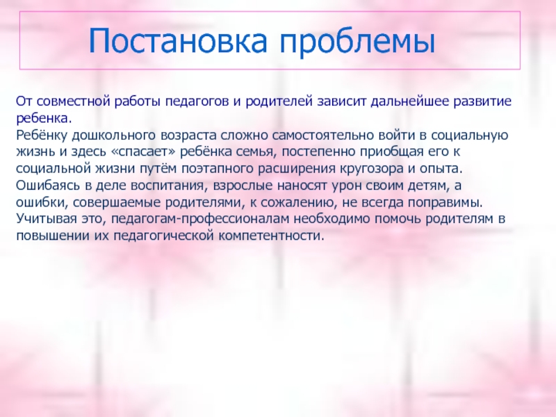 Ребёнку дошкольного возраста сложно самостоятельно войти в социальную жизнь и здесь «спасает» ребёнка семья, постепенно приобщая его к социальной жизни путём поэтапного расширения кругозора и опыта. Ошибаясь в деле воспитания, взрослые наносят урон своим детям, а ошибки, совершаемые родителями, к сожалению, не всегда поправимы. Учитывая это, педагогам-профессионалам необходимо помочь родителям в повышении их педагогической компетентности.