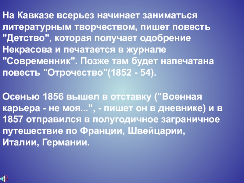 Осенью 1856 вышел в отставку ("Военная карьера - не моя...", - пишет он в дневнике) и в 1857 отправился в полугодичное заграничное путешествие по Франции, Швейцарии, Италии, Германии.