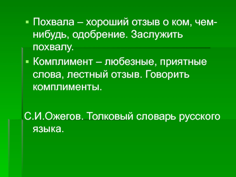 Похвала – хороший отзыв о ком, чем-нибудь, одобрение. Заслужить похвалу.