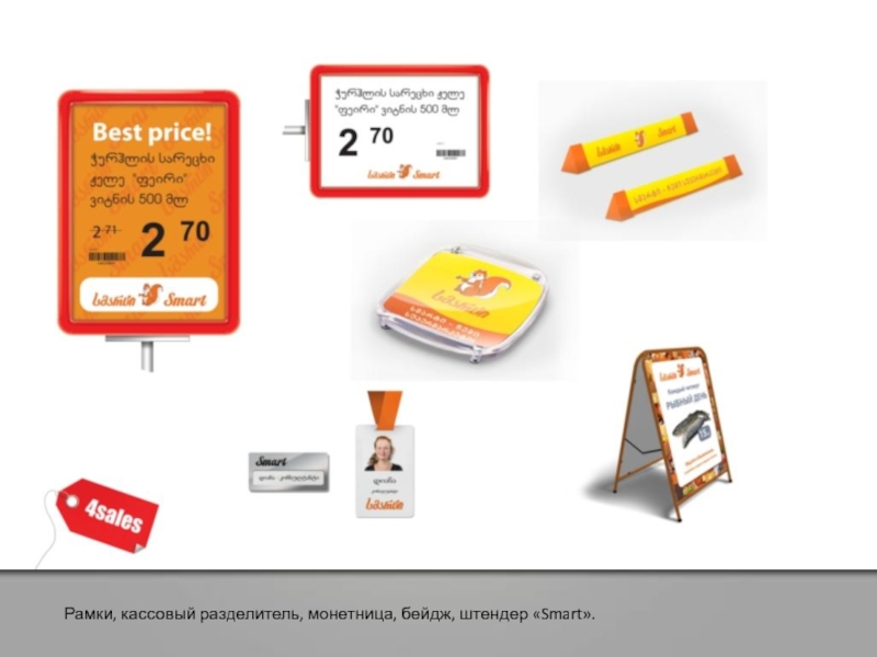Рамки, кассовый разделитель, монетница, бейдж, штендер «Smart».