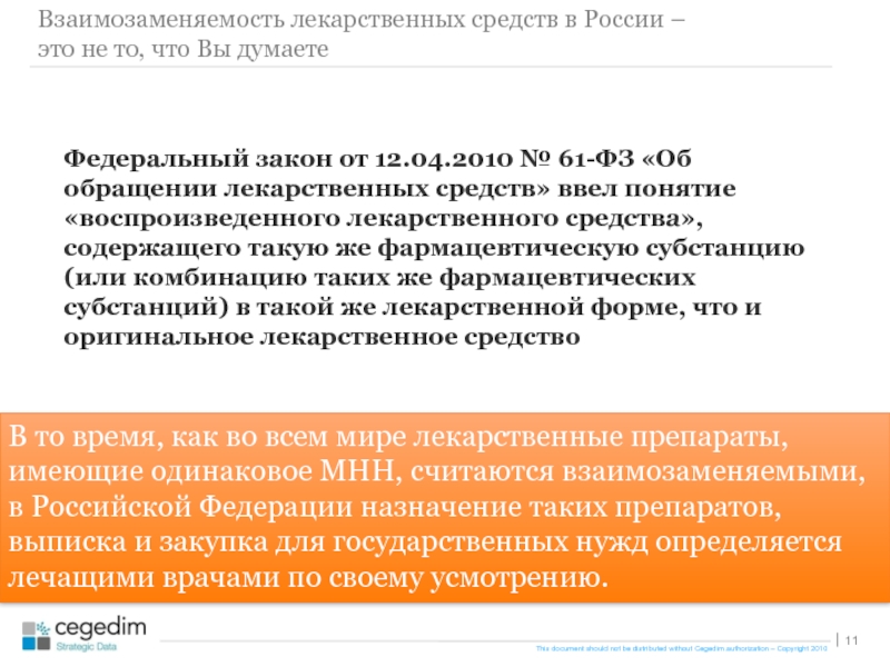 Федеральный закон от 12.04.2010 № 61-ФЗ «Об обращении лекарственных средств» ввел понятие «воспроизведенного лекарственного средства», содержащего такую же фармацевтическую субстанцию (или комбинацию таких же фармацевтических субстанций) в такой же лекарственной форме, что и оригинальное лекарственное средство