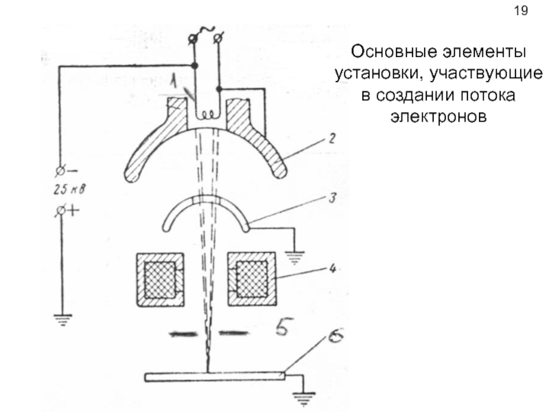 Слайд 19Основные элементы установки, участвующие в создании потока электронов
