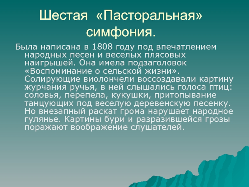 и веселых плясовых наигрышей. Она имела подзаголовок «Воспоминание о сельской жизни». Солирующие виолончели воссоздавали картину журчания ручья, в ней слышались голоса птиц: соловья, перепела, кукушки, притопывание танцующих под веселую деревенскую песенку. Но внезапный раскат грома нарушает народное гулянье. Картины бури и разразившейся грозы поражают воображение слушателей.