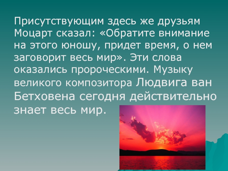 придет время, о нем заговорит весь мир». Эти слова оказались пророческими. Музыку великого композитора Людвига ван Бетховена сегодня действительно знает весь мир.