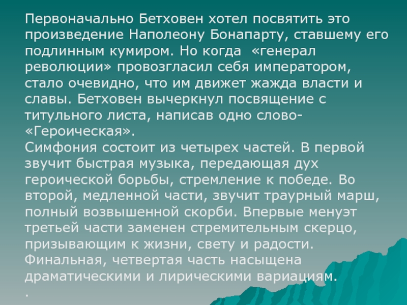 кумиром. Но когда «генерал революции» провозгласил себя императором, стало очевидно, что им движет жажда власти и славы. Бетховен вычеркнул посвящение с титульного листа, написав одно слово- «Героическая».