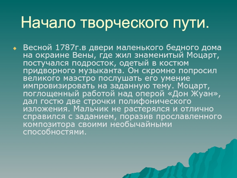где жил знаменитый Моцарт, постучался подросток, одетый в костюм придворного музыканта. Он скромно попросил великого маэстро послушать его умение импровизировать на заданную тему. Моцарт, поглощенный работой над оперой «Дон Жуан»,дал гостю две строчки полифонического изложения. Мальчик не растерялся и отлично справился с заданием, поразив прославленного композитора своими необычайными способностями.