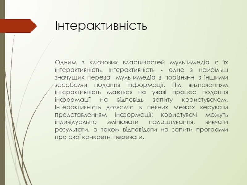 з найбільш значущих переваг мультимедіа в порівнянні з іншими засобами подання інформації. Під визначенням інтерактивність мається на увазі процес подання інформації на відповідь запиту користувачем. Інтерактивність дозволяє в певних межах керувати представленням інформації: користувачі можуть індивідуально змінювати налаштування, вивчати результати, а також відповідати на запити програми про свої конкретні переваги.