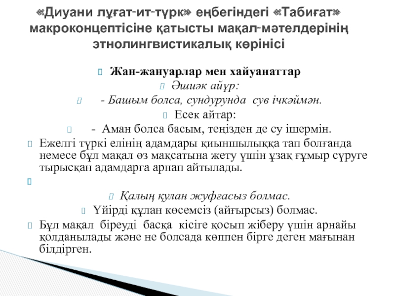 «Диуани лұғат-ит-түрк» еңбегіндегі «Табиғат» макроконцептісіне қатысты мақал-мәтелдерінің этнолингвистикалық көрінісі
