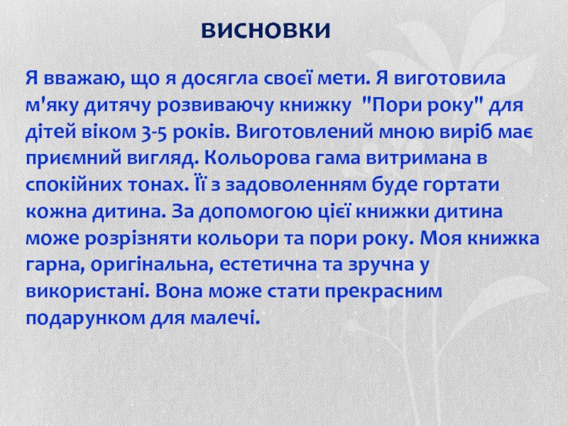Я вважаю, що я досягла своєї мети. Я виготовила м'яку дитячу розвиваючу книжку "Пори року" для дітей віком 3-5 років. Виготовлений мною виріб має приємний вигляд. Кольорова гама витримана в спокійних тонах. Її з задоволенням буде гортати кожна дитина. За допомогою цієї книжки дитина може розрізняти кольори та пори року. Моя книжка гарна, оригінальна, естетична та зручна у використані. Вона може стати прекрасним подарунком для малечі.