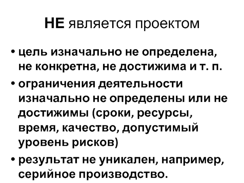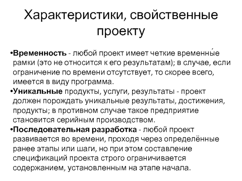 Уникальные продукты, услуги, результаты - проект должен порождать уникальные результаты, достижения, продукты; в противном случае такое предприятие становится серийным производством.