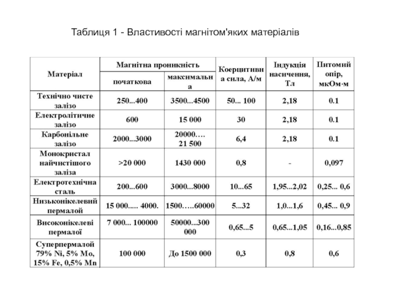 Слайд 5Таблиця 1 - Властивості магнітом'яких матеріалів