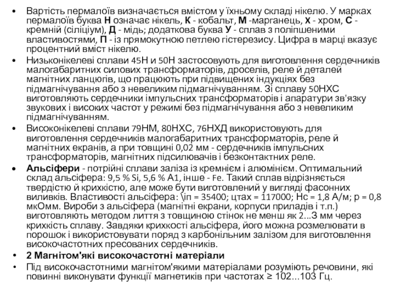 Слайд 8Вартість пермалоїв визначається вмістом у їхньому складі нікелю. У марках пермалоїв