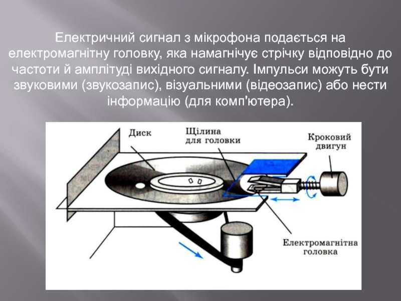 Слайд 3Електричний сигнал з мікрофона подається на електромагнітну головку, яка намагнічує стрічку