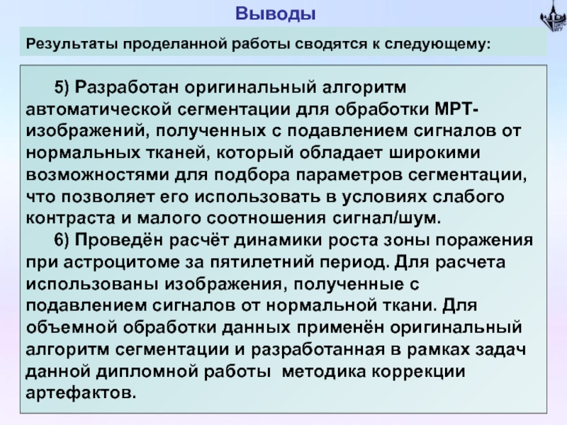 А) разработать и реализовать алгоритм сегментации зоны повышенного МР-сигнала (зоны поражения) и методику оценки площади сегментируемой зоны.