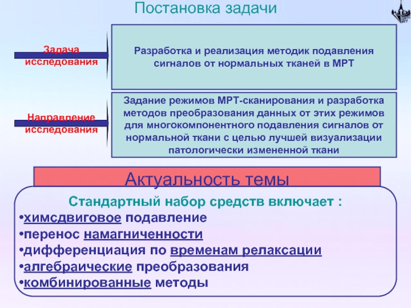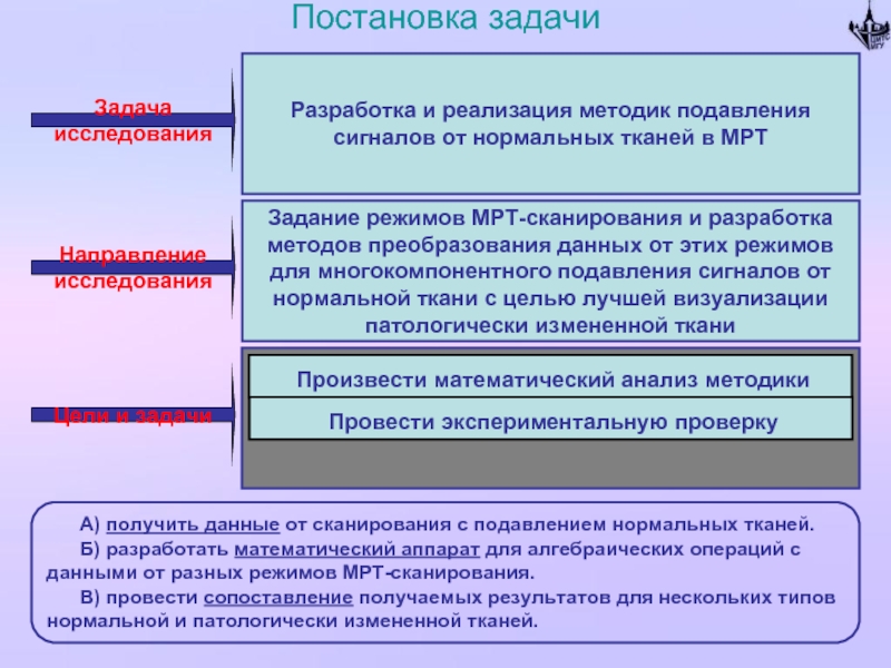 Задание режимов МРТ-сканирования и разработка методов преобразования данных от этих режимов для многокомпонентного подавления сигналов от нормальной ткани с целью лучшей визуализации патологически измененной ткани