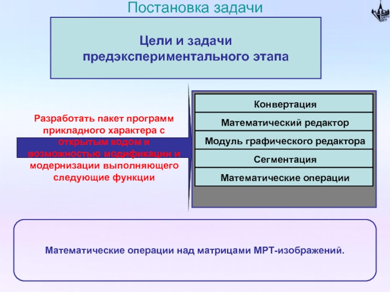 Данное прикладное программное обеспечения должно конвертировать МРТ-данные из специализированного фирменного формата, разработанного для ОС IRIX на платформе SiliconGraphics, в форматы, пригодные для графических редакторов в среде MS Windows на платформе PC. Благодаря этому предполагалось решать задачи: