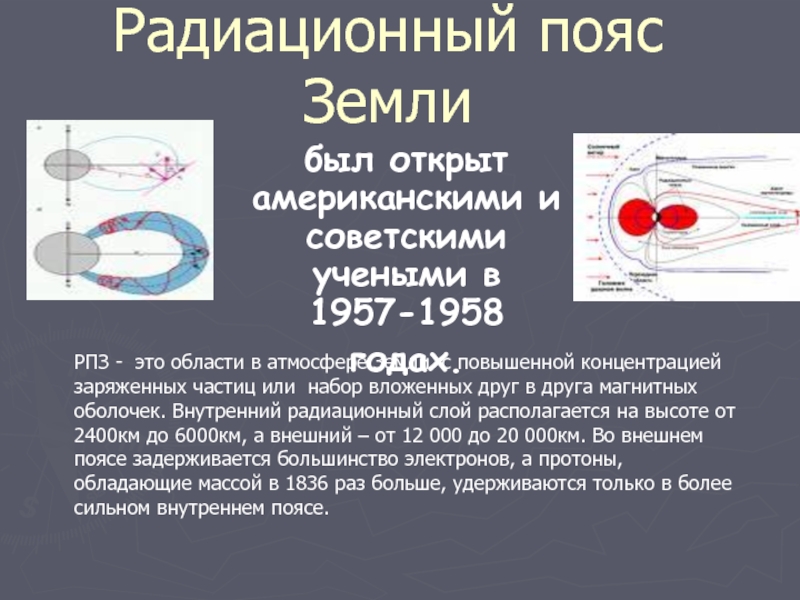 РПЗ - это области в атмосфере Земли с повышенной концентрацией заряженных частиц или набор вложенных друг в друга магнитных оболочек. Внутренний радиационный слой располагается на высоте от 2400км до 6000км, а внешний – от 12 000 до 20 000км. Во внешнем поясе задерживается большинство электронов, а протоны, обладающие массой в 1836 раз больше, удерживаются только в более сильном внутреннем поясе.