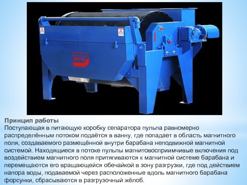 в ванну, где попадает в область магнитного поля, создаваемого размещённой внутри барабана неподвижной магнитной системой. Находящиеся в потоке пульпы магнитовосприимчивые включения под воздействием магнитного поля притягиваются к магнитной системе барабана и перемещаются его вращающейся обечайкой в зону разгрузки, где под действием напора воды, подаваемой через расположенные вдоль магнитного барабана форсунки, сбрасываются в разгрузочный жёлоб.