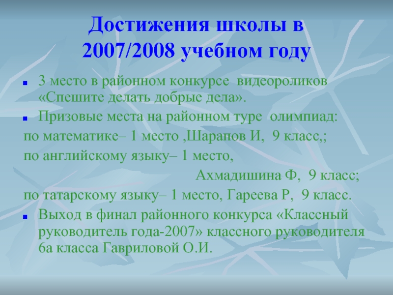 Выход в финал районного конкурса «Классный руководитель года-2007» классного руководителя 6а класса Гавриловой О.И.