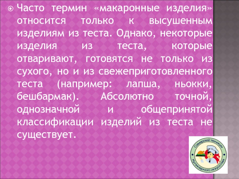 Слайд 4Часто термин «макаронные изделия» относится только к высушенным изделиям из теста.