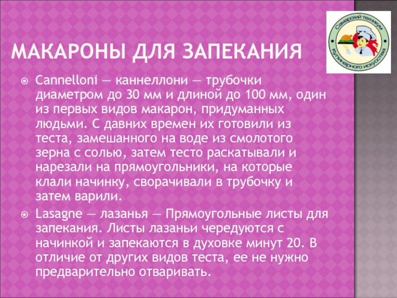 Слайд 24МАКАРОНЫ ДЛЯ ЗАПЕКАНИЯ