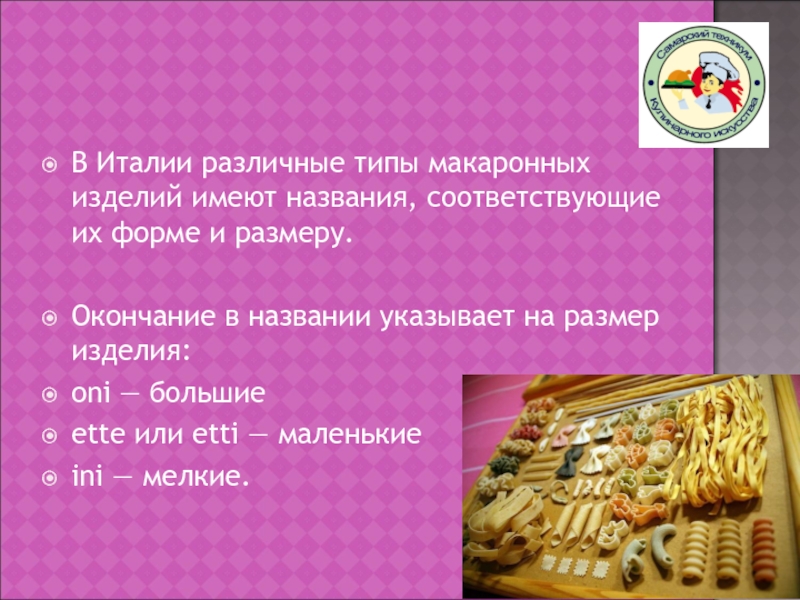 Слайд 11В Италии различные типы макаронных изделий имеют названия, соответствующие их форме