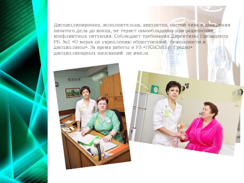 теряет самообладания при разрешении конфликтных ситуации. Соблюдает требования Директивы Президента РБ №1 «О мерах по укреплению общественной безопасности и дисциплины». За время работы в УЗ «ГКБСМП г. Гродно» дисциплинарных взысканий не имела
