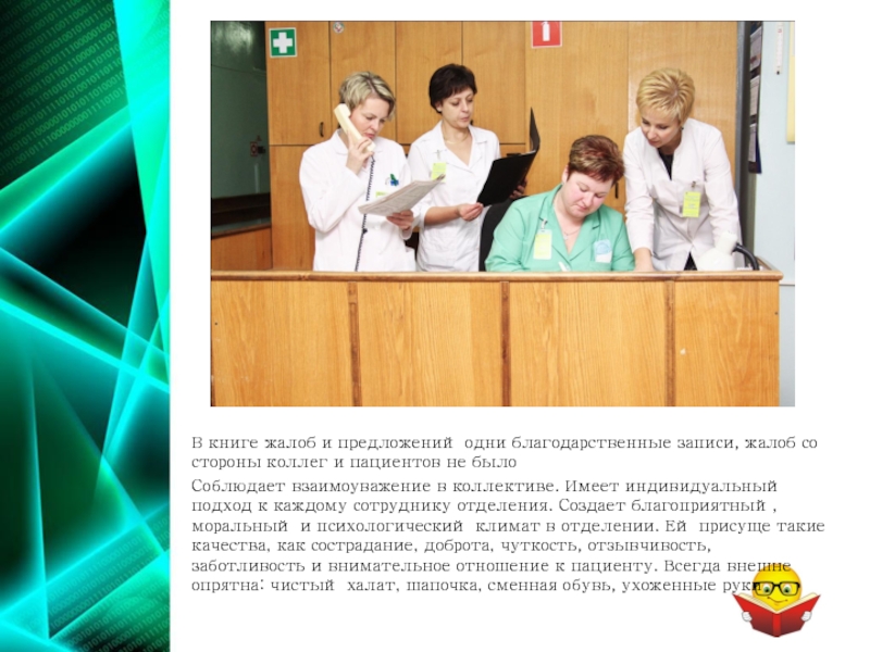 Соблюдает взаимоуважение в коллективе. Имеет индивидуальный подход к каждому сотруднику отделения. Создает благоприятный, моральный и психологический климат в отделении. Ей присуще такие качества, как сострадание, доброта, чуткость, отзывчивость, заботливость и внимательное отношение к пациенту. Всегда внешне опрятна: чистый халат, шапочка, сменная обувь, ухоженные руки