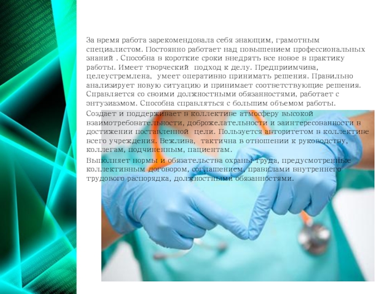 Слайд 3За время работа зарекомендовала себя знающим, грамотным специалистом. Постоянно работает над