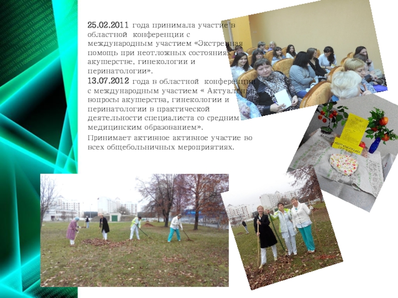 13.07.2012 года в областной конференции с международным участием « Актуальные вопросы акушерства, гинекологии и перинатологии в практической деятельности специалиста со средним медицинским образованием».